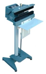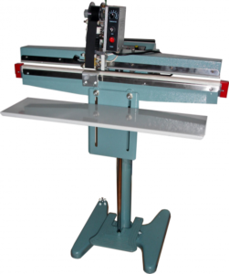 Selladora de pedal, de impulso, Construido en acero al carbono pintado, ahorra energía, conexión a 110 Voltios, para bolsas de hasta 450 mm de ancho, también puede sellar y cortar, viene con una mesa auxiliar para apoyar la bolsa y tiene una base metálica bastante fuerte.